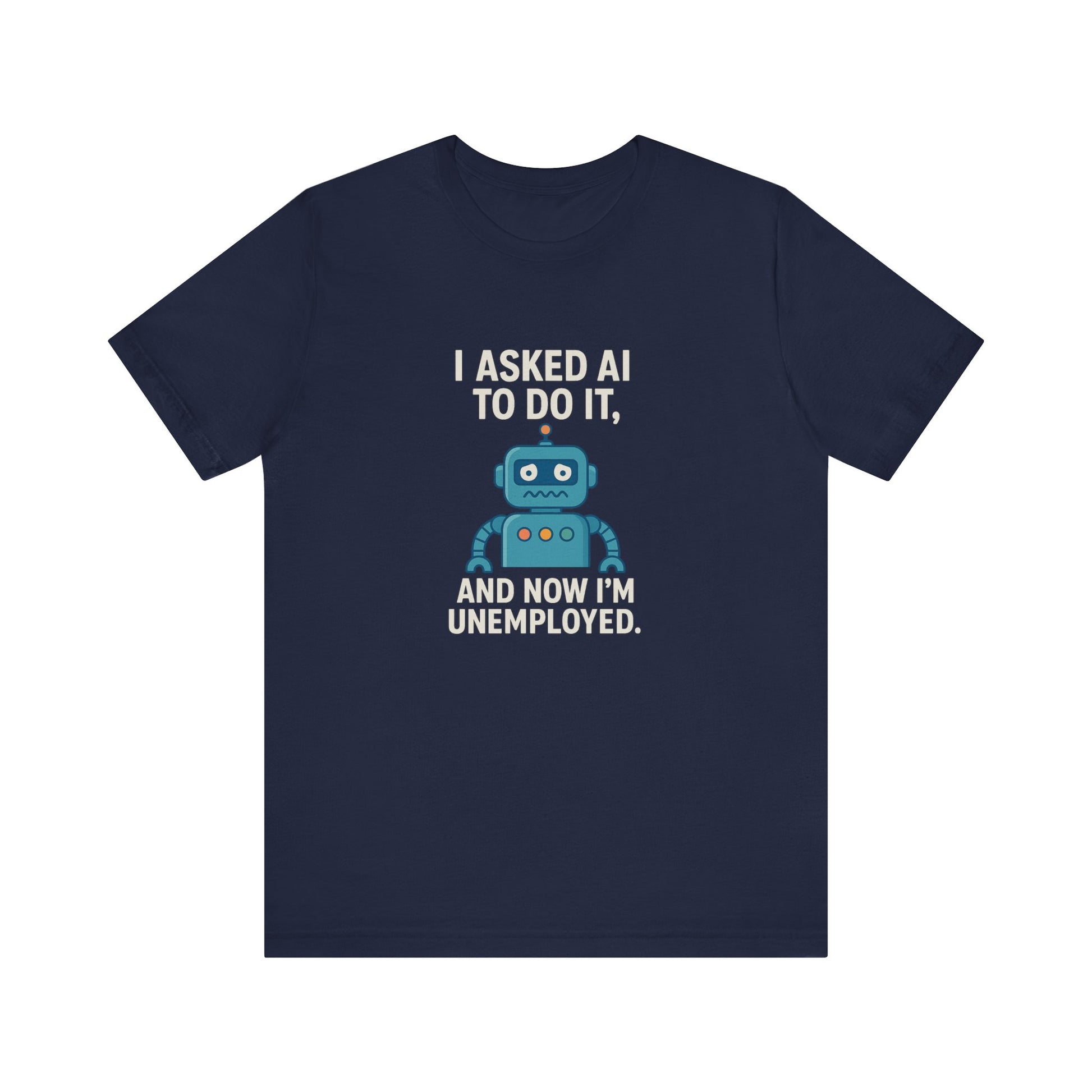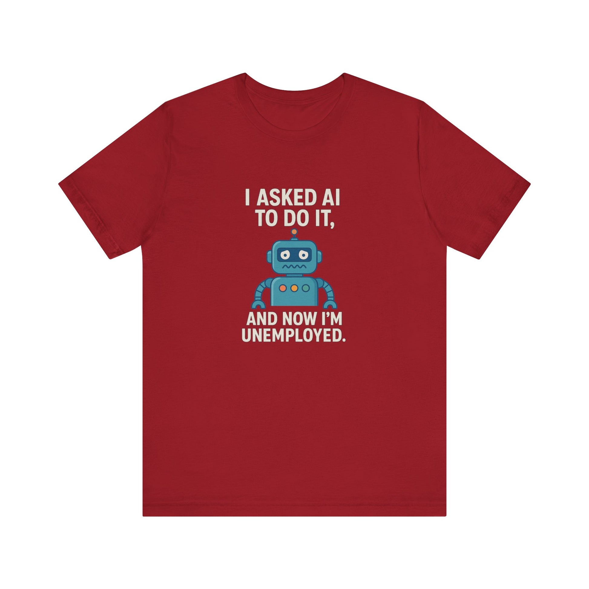 A humorous and slightly self-deprecating T-shirt featuring the phrase 'I asked AI to do it and now I’m unemployed'. Perfect for those who enjoy tech humor and want to make a statement. Ideal for casual wear, lounging at home, or as a conversation starter at gatherings. Great gift for tech enthusiasts, programmers, and anyone with a sense of humor. Suitable for occasions like casual Fridays at work, tech conventions, and birthday gifts for the tech-savvy.