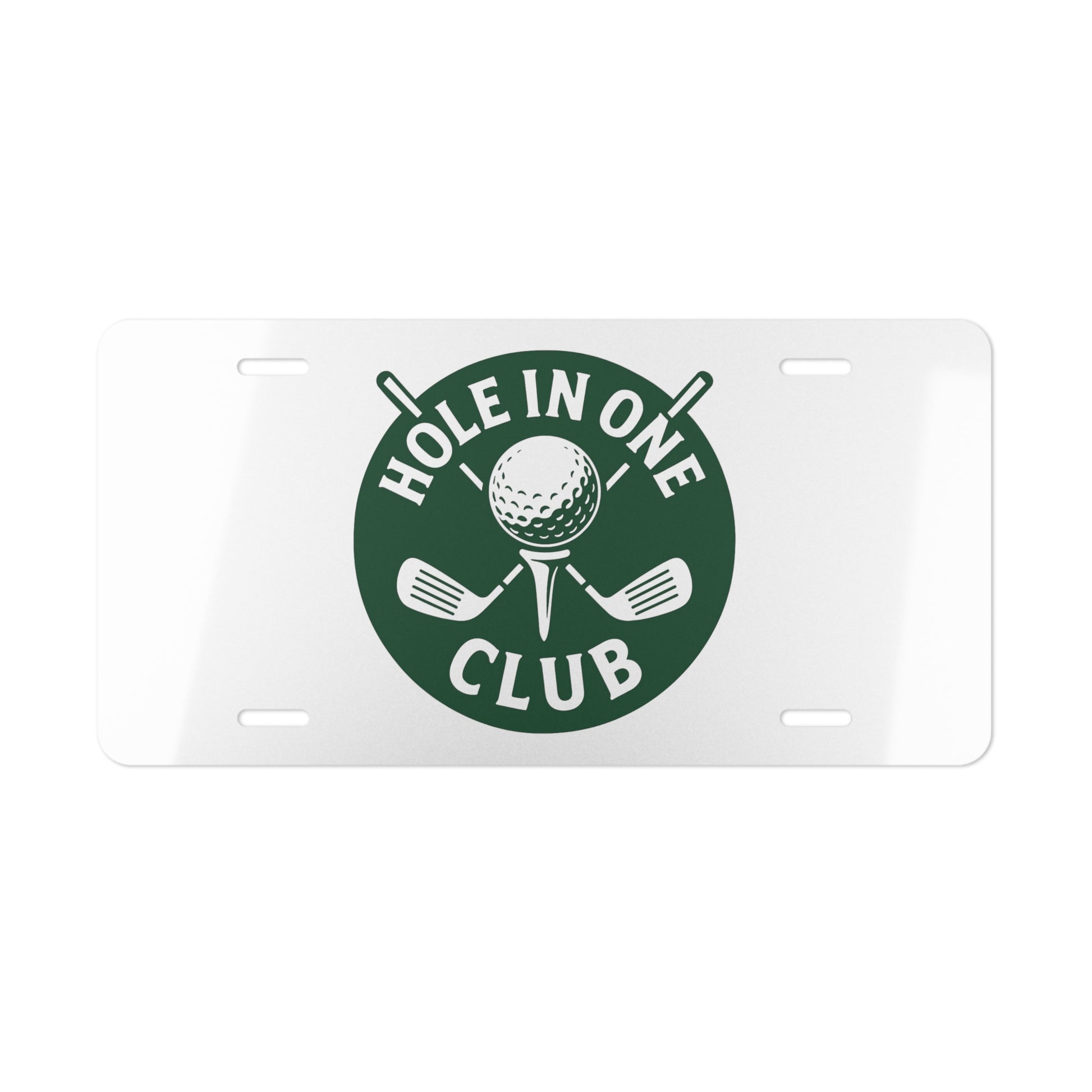 Golf-Themed Vanity Plate - 'Hole in One Club' Decor. This aluminum vanity plate features vibrant colors and a fun golf design, perfect for golf enthusiasts looking to add a personalized touch to their car or home decor. Great for golf lovers and would make a unique gift for birthdays, Father's Day, or any golf-related celebration.